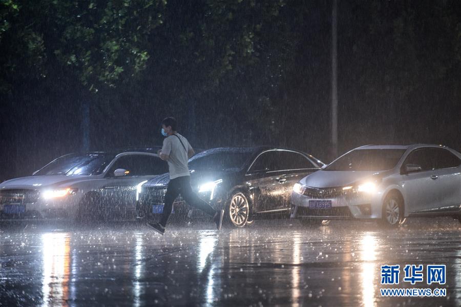 8月12日,北京市大兴区亦庄镇,一名没带雨具的市民在雨中奔跑。新华社记者 彭子洋 摄