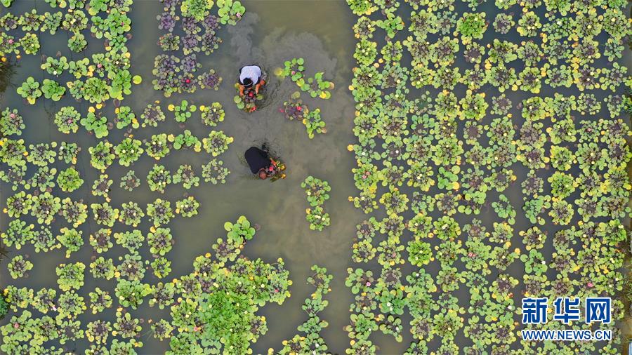 8月12日,河北省滦州市茨榆坨镇草塘坨村花农在大棚内打理种植的莲花(无人机照片)。新华社记者 牟宇 摄