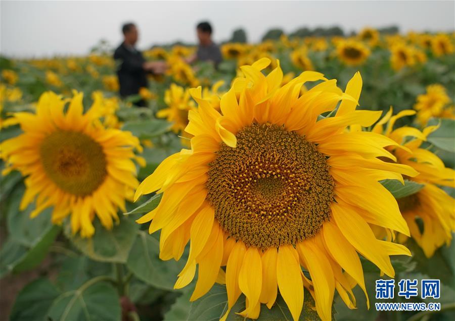 8月12日,在尚义县三工地镇有德元村,农民在田间管护旱作油葵。新华社记者 杨世尧 摄