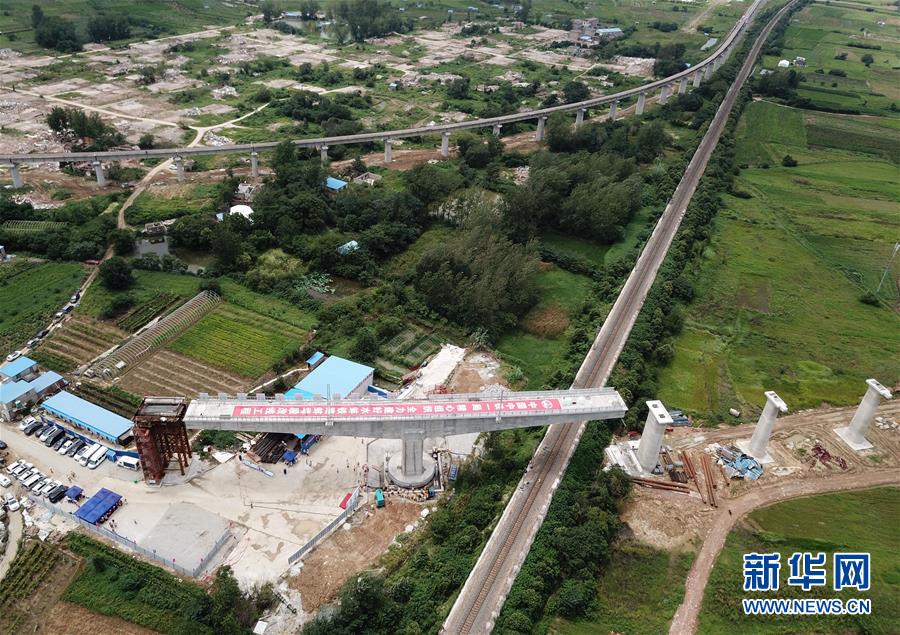 这是8月12日拍摄的水蚌铁路蚌埠段改线工程东站疏解线特大桥跨越京沪铁路上行线转体梁转体施工现场(无人机照片)。当日,由中铁一局承建的水蚌铁路蚌埠段改线工程东站疏解线特大桥跨越京沪铁路上行线64米T构转体梁成功实现转体。新华社记者 刘军喜 摄