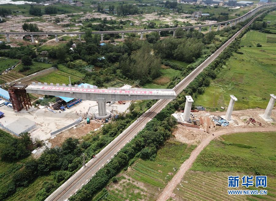 这是8月12日拍摄的水蚌铁路蚌埠段改线工程东站疏解线特大桥跨越京沪铁路上行线转体梁转体施工现场(无人机照片)。新华社记者 刘军喜 摄