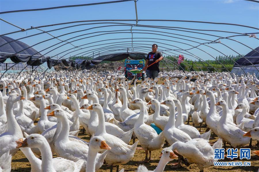 8月12日,在镇赉县黑鱼泡镇岔台村,村民王木尧在投喂鹅饲料。