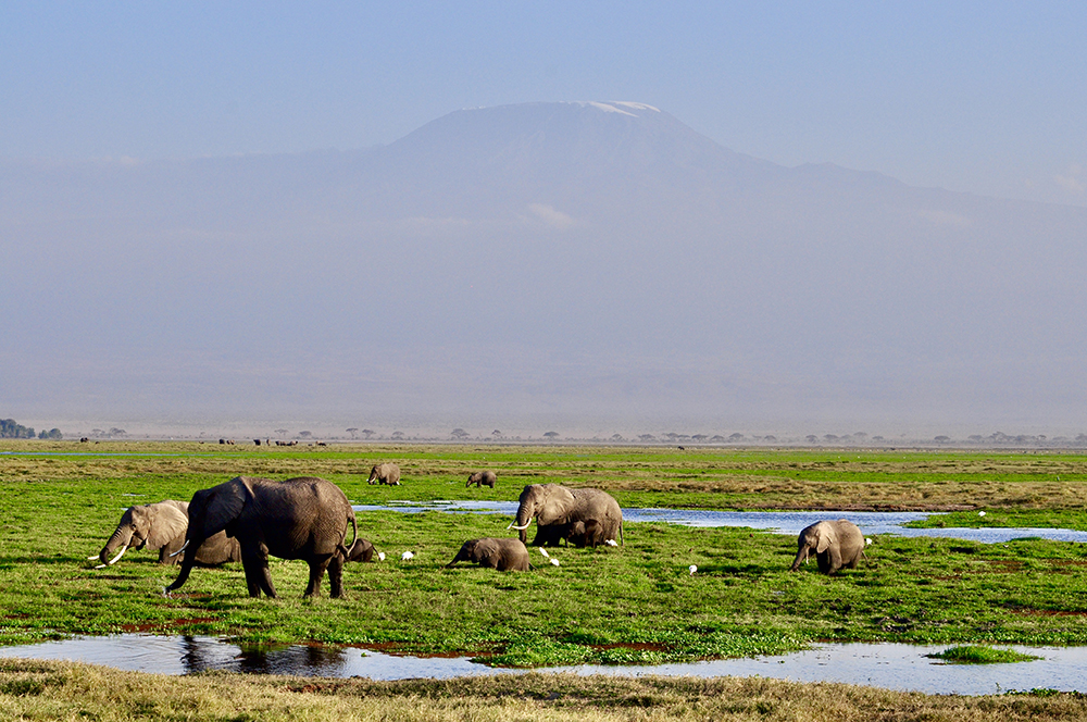 肯尼亚东南部,与坦桑尼亚接壤的安博赛利国家公园,距内罗毕240公里,因水草丰美而成为野生非洲大象的乐园。