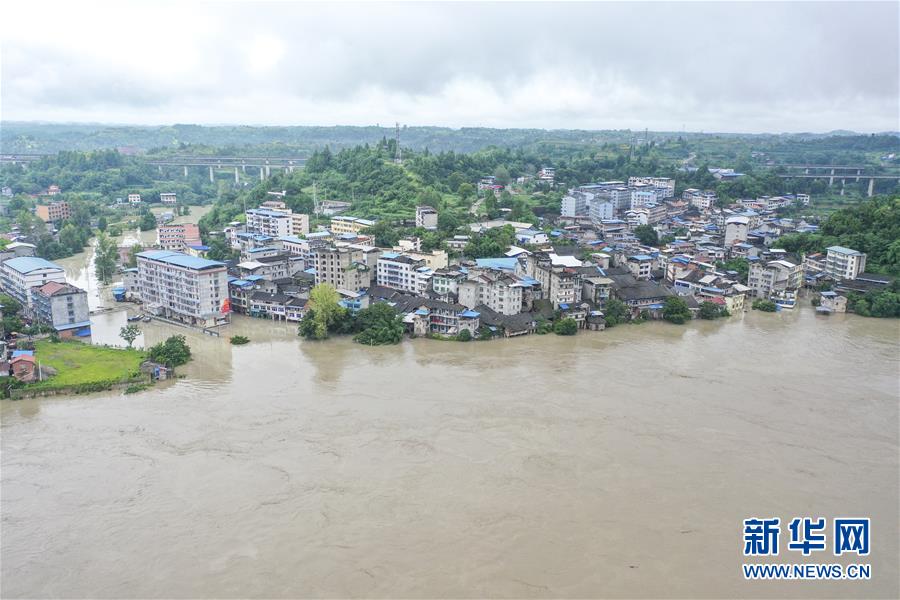 8月13日,在重庆市潼南区玉溪镇,涪江水位明显上涨(无人机照片)。受上游强降雨影响,嘉陵江近日出现明显涨水过程,“嘉陵江2020年第1号洪水”已在嘉陵江支流涪江形成。重庆市正式启动洪水防御Ⅱ级应急响应。据初步统计,截至13日16时30分,位于涪江畔的重庆市潼南区,沿涪江7个镇街不同程度受灾,受灾人数8209人,转移人口6658人,农作物受灾面积5579亩。新华社记者黄伟摄