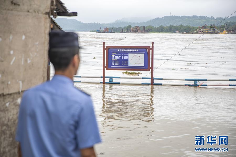 8月13日,在重庆市潼南区米心镇,涪江水位明显上涨,一名工作人员在岸边执勤。受上游强降雨影响,嘉陵江近日出现明显涨水过程,“嘉陵江2020年第1号洪水”已在嘉陵江支流涪江形成。重庆市正式启动洪水防御Ⅱ级应急响应。据初步统计,截至13日16时30分,位于涪江畔的重庆市潼南区,沿涪江7个镇街不同程度受灾,受灾人数8209人,转移人口6658人,农作物受灾面积5579亩。新华社记者黄伟摄