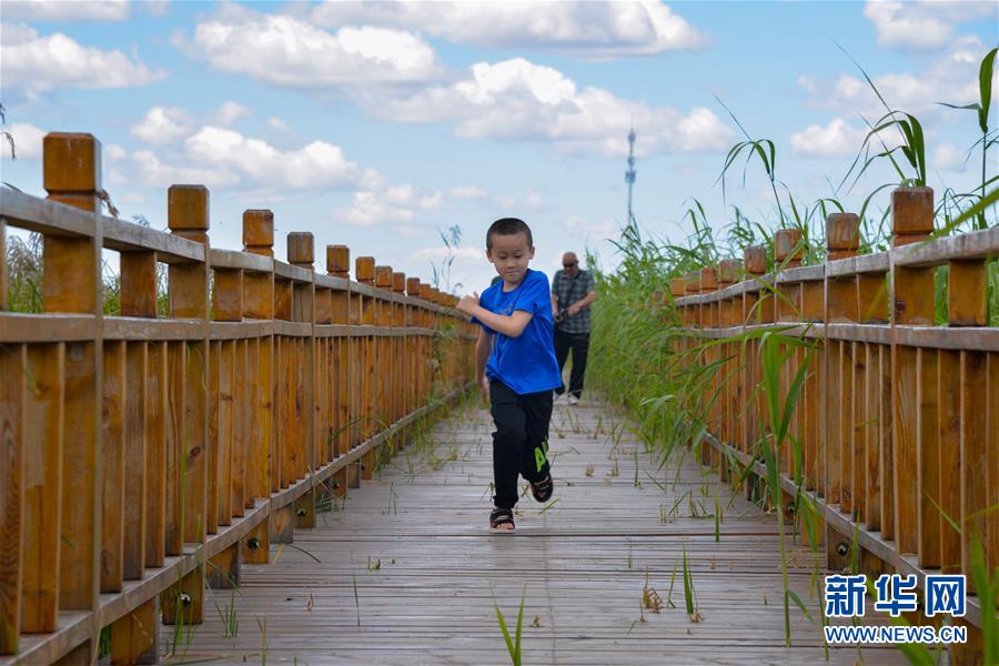 8月11日,游客在克什克腾旗达里诺尔湖北岸景区游玩。克什克腾旗位于内蒙古自治区赤峰市西北部,境内的湖泊、河流、草原、森林等自然景观,让人们流连忘返。新华社记者徐钦摄
