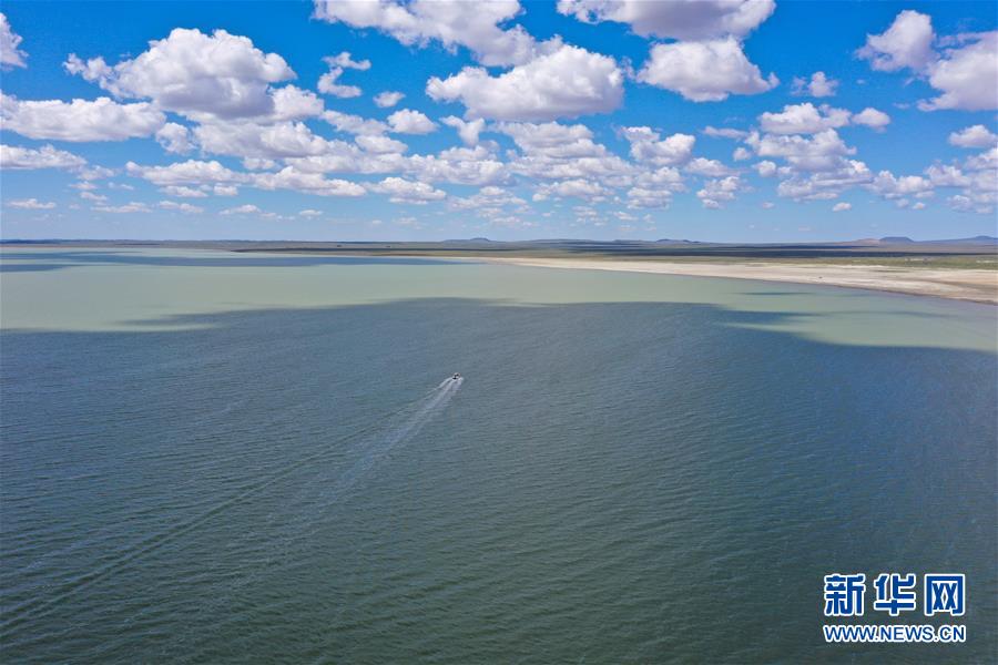 8月11日,游客在克什克腾旗达里诺尔湖乘坐快艇游玩(无人机照片)。克什克腾旗位于内蒙古自治区赤峰市西北部,境内的湖泊、河流、草原、森林等自然景观,让人们流连忘返。新华社记者徐钦摄
