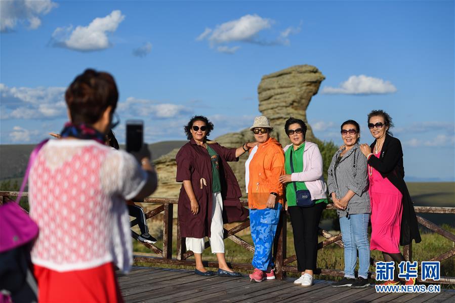 游客在克什克腾石阵景区拍照留影(8月11日摄)。克什克腾旗位于内蒙古自治区赤峰市西北部,境内的湖泊、河流、草原、森林等自然景观,让人们流连忘返。新华社记者刘磊摄