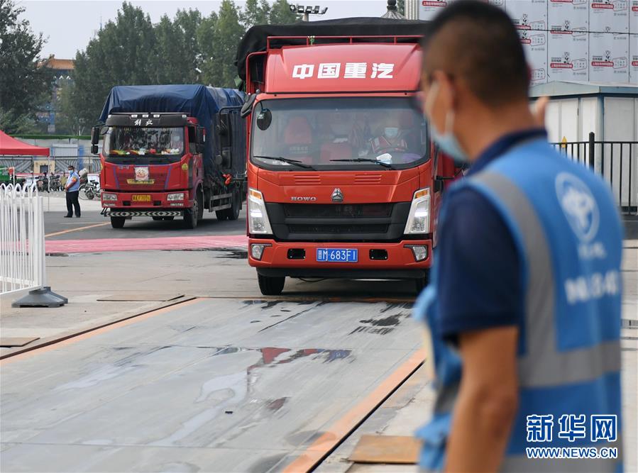 进场车辆进入新发地批发市场周转新区(8月6日摄)。 新华社记者 张晨霖 摄