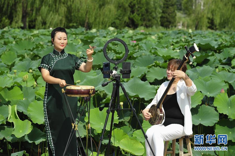 8月13日,河北省河间市西河大鼓非遗项目艺人李雪(左)、张领娣通过网络直播表演西河大鼓。暑假期间,河北省河间市文化馆推出非遗展演“云端”播系列活动,组织当地西河大鼓非遗项目传承人利用视频直播的方式进行线上展演,通过“云端”传承非遗文化。新华社记者朱旭东摄