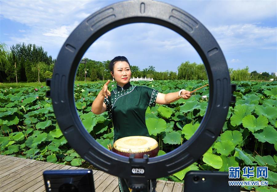 8月13日,河北省河间市西河大鼓非遗项目艺人李雪通过网络直播表演西河大鼓。暑假期间,河北省河间市文化馆推出非遗展演“云端”播系列活动,组织当地西河大鼓非遗项目传承人利用视频直播的方式进行线上展演,通过“云端”传承非遗文化。新华社记者朱旭东摄
