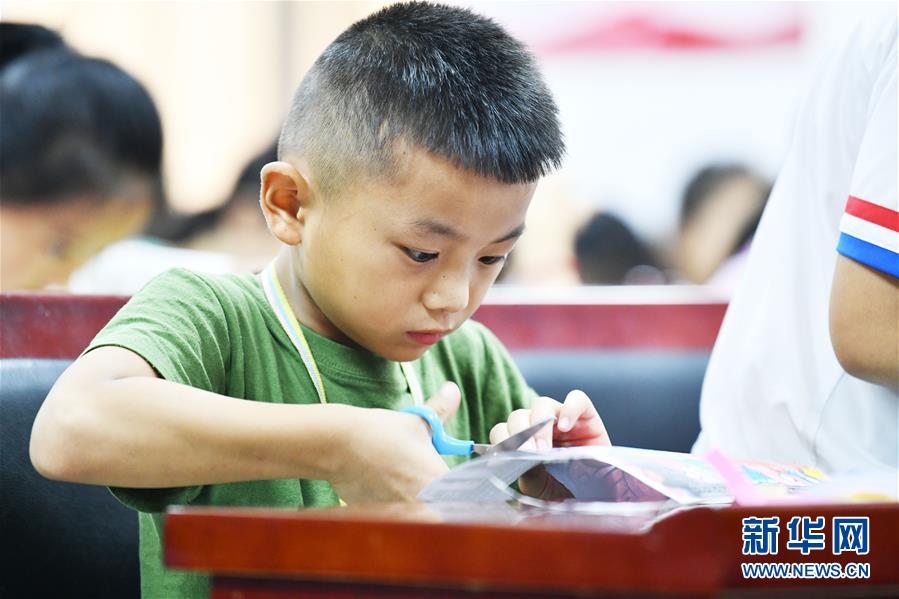 8月13日,贵州省思南县双塘街道丽景社区易地扶贫搬迁安置点的孩子在学习剪纸。新华社记者杨文斌摄