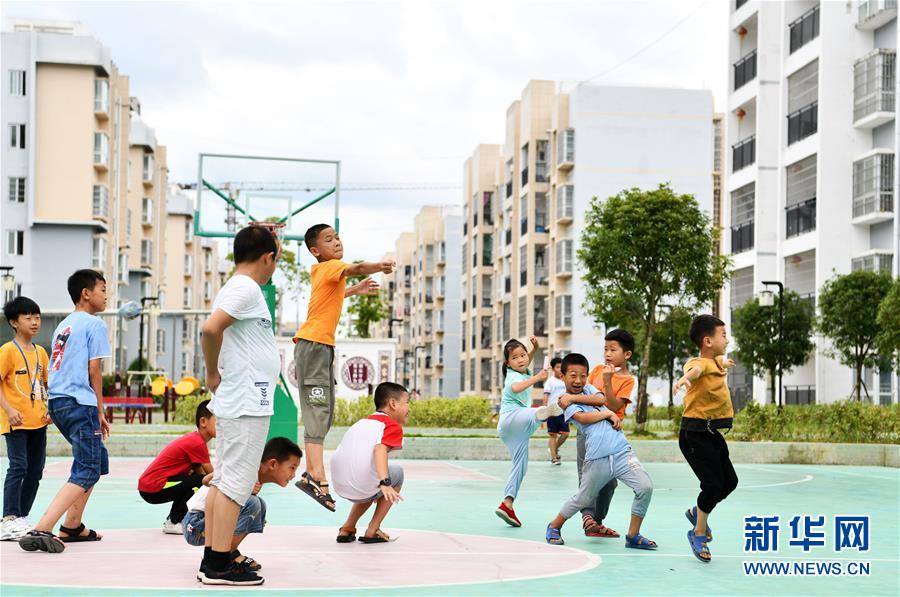 8月13日,在贵州省思南县双塘街道丽景社区易地扶贫搬迁安置点,孩子们和志愿者在丢沙包。新华社记者杨文斌摄