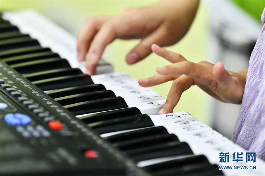 8月13日,在贵州省思南县双塘街道丽景社区易地扶贫搬迁安置点,志愿者在指导孩子学弹电子琴。新华社记者杨文斌摄