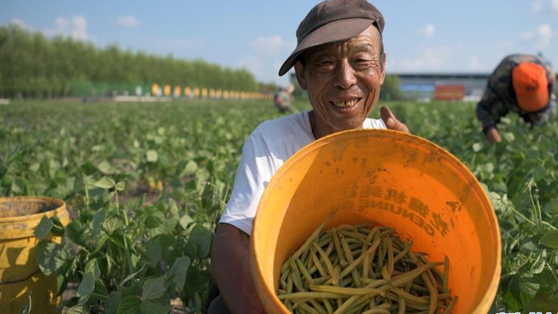 7月14日,在克东县昌盛乡青刀豆蔬菜种植示范基地,昌盛乡安全村脱贫户丁绍兴展示刚摘下的青刀豆。