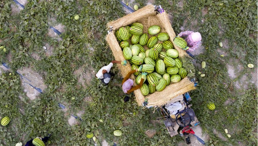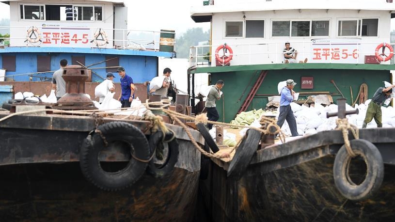 7月14日,当地村民往船只上搬运砂石袋。当地防汛部门组织船只装载砂石袋等防汛物资,运往圩堤保防汛。