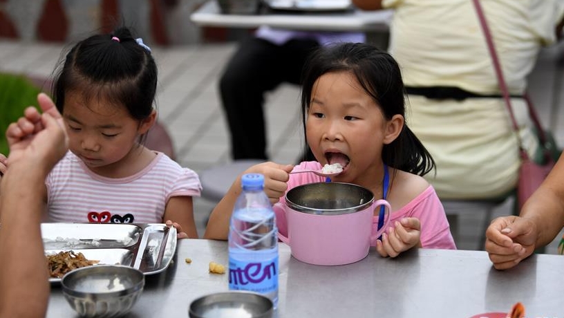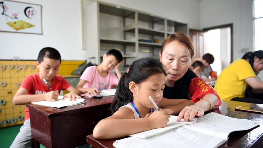 7月16日,在安徽省宿松县洲头乡中心小学集中安置点,教师志愿者辅导孩子们完成暑假作业。