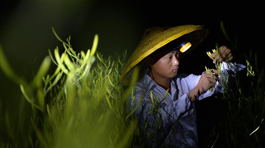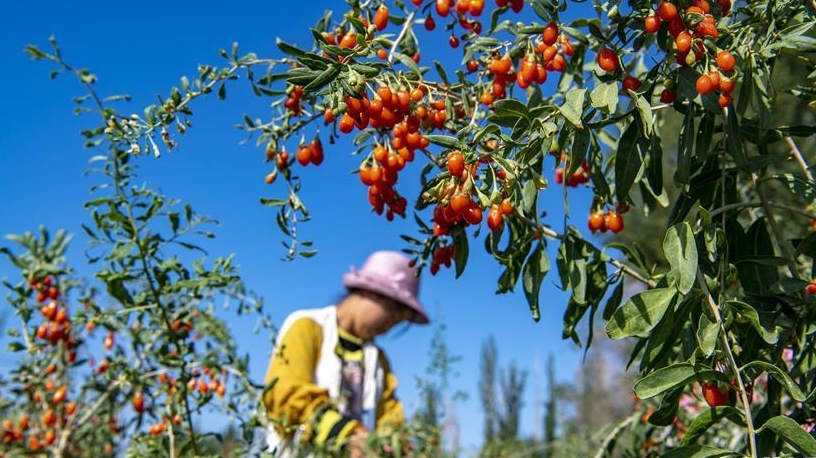 7月13日,在新疆精河县托里镇的一处枸杞种植园,村民在采收枸杞。