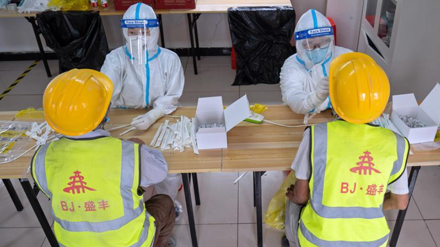 7月2日,在北京市大兴区中建三局二公司北京公司一项目建筑工地的临时核酸检测采样点,建筑工地人员排队等候采样。