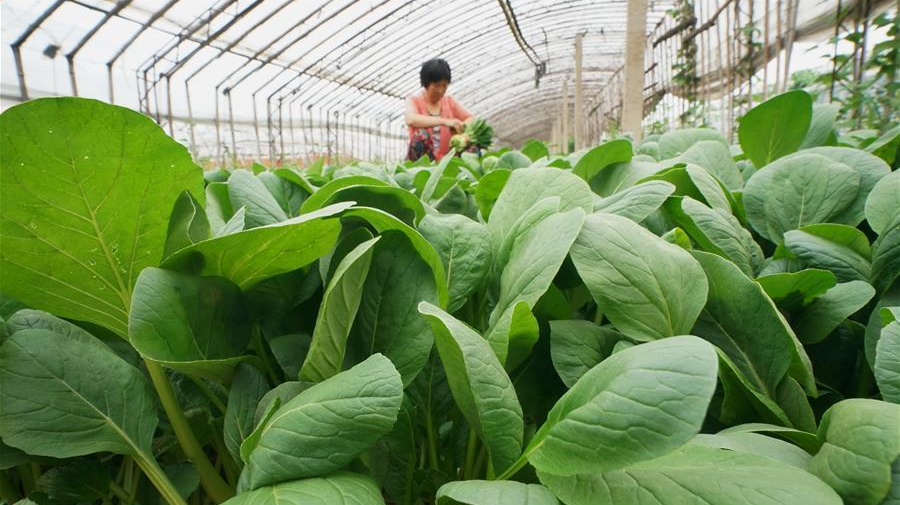 6月18日,唐山市丰南区黄各庄镇双坨村农民在大棚内收获蔬菜。