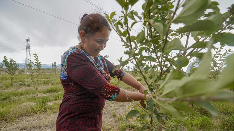 在新疆察布查尔锡伯自治县一处生态扶贫林,当地贫困户将修剪完的树枝拉回家喂牲畜(6月16日摄)。