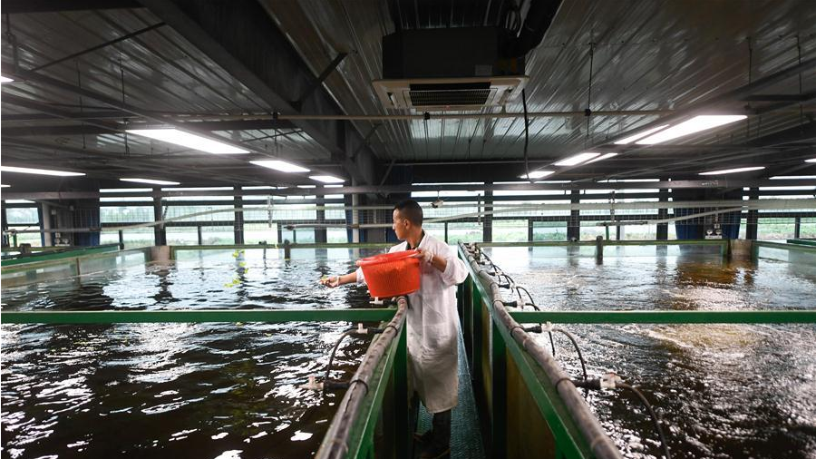 6月18日,技术人员在智能化循环水养殖车间进行管理。