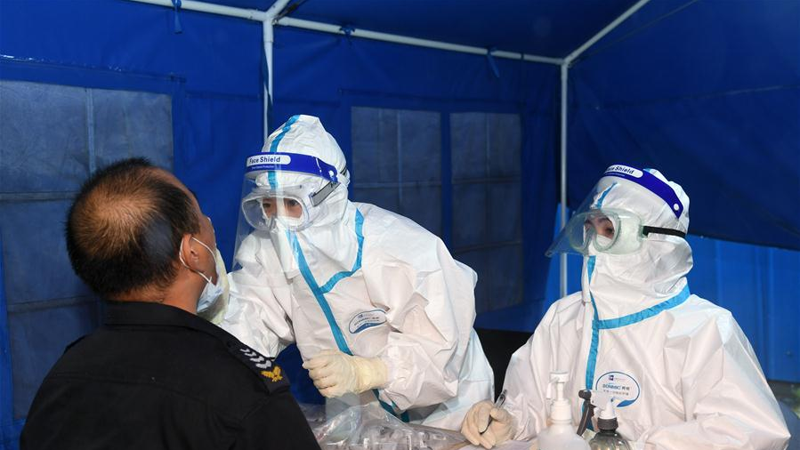 6月18日,在海淀区区级核酸检测采样点,医护人员为市民进行核酸检测采样。