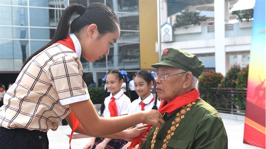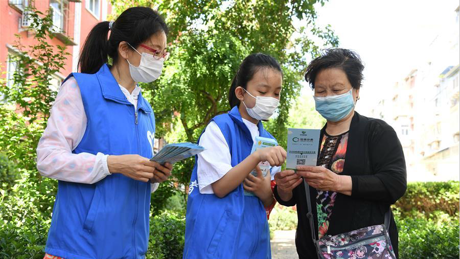 在北京市海淀区中关村街道青云北社区,胡欣然(中)与社区工作人员(左)一起为社区居民发放垃圾分类宣传手册。