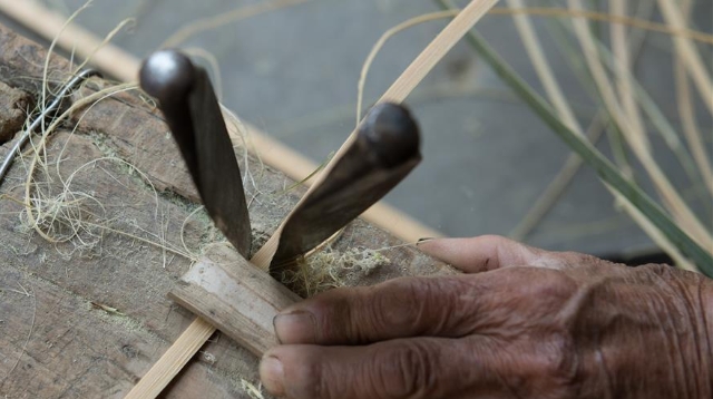 5月12日,浙江诸暨龙溪村的百岁老人蔡渭东在家中处理竹篾。