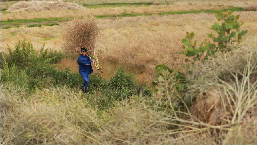 时下,贵州省黔西县的43万亩油菜籽进入收获期,村民们忙着在地里收获油菜籽,田间地头一片繁忙景象。