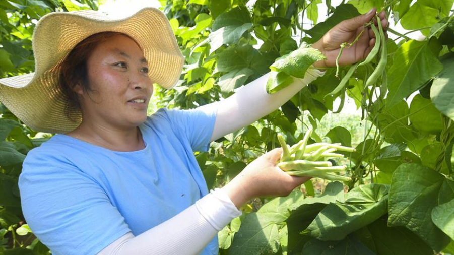 8月2日,已脱贫的建档立卡贫困户吴冬梅在河北省大厂回族自治县现代农业科技示范园区一家企业采摘蔬菜。