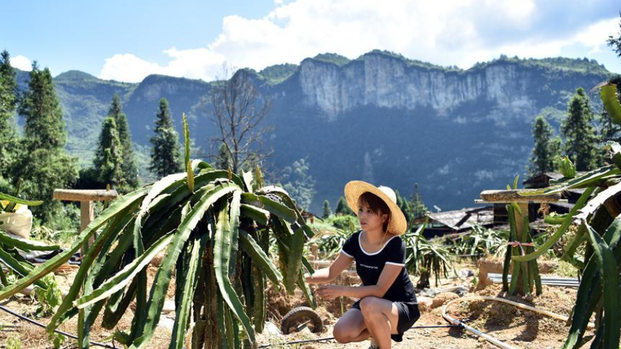 8月3日,在碗米坡镇首八峒村,种植基地负责人易润菊采摘成熟的火龙果。
