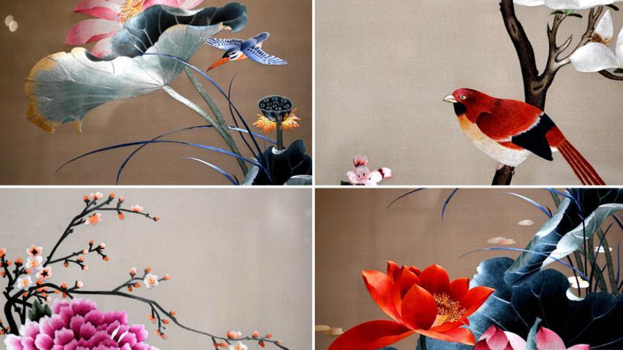 在开封市素花宋绣工艺有限公司的展示馆里,王素花向徒弟刘冬红讲解刺绣作品上的难点(7月30日摄)。