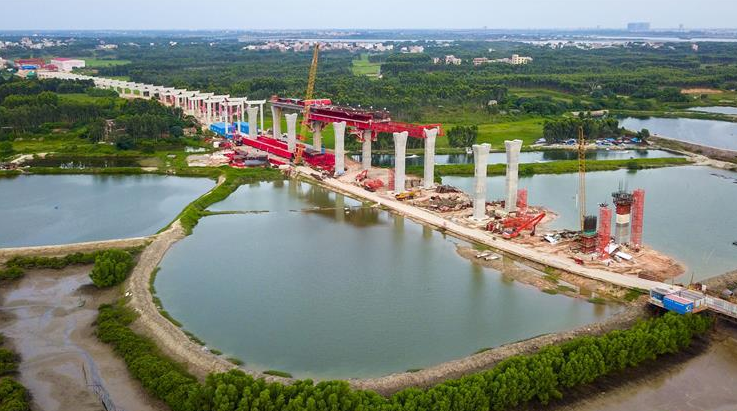 广东:湛江调顺跨海大桥步入主塔施工