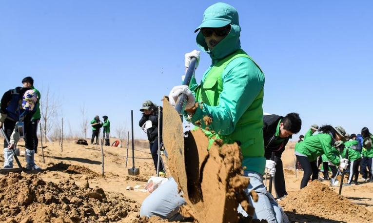 当日,200余名中韩两国青年志愿者来到内蒙古自治区达拉特旗库布其沙漠种树。