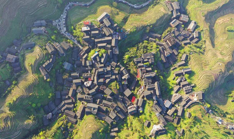 这是3月29日无人机拍摄的广西融水苗族自治县杆洞乡党鸠村的田园春色。