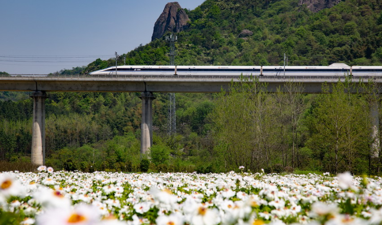 随着气温回升,安徽省铜陵市境内的凤丹竞相绽放,高铁列车穿行其间,成为春日里一道美丽的风景线。