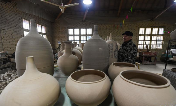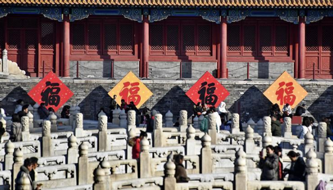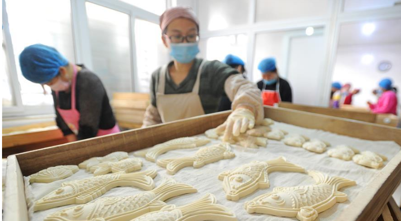 1月31日,河北黄骅市一家面花作坊的工人在查看面花。春节前夕,当地面花制作工厂加班加点制作面花,供应春节市场。
