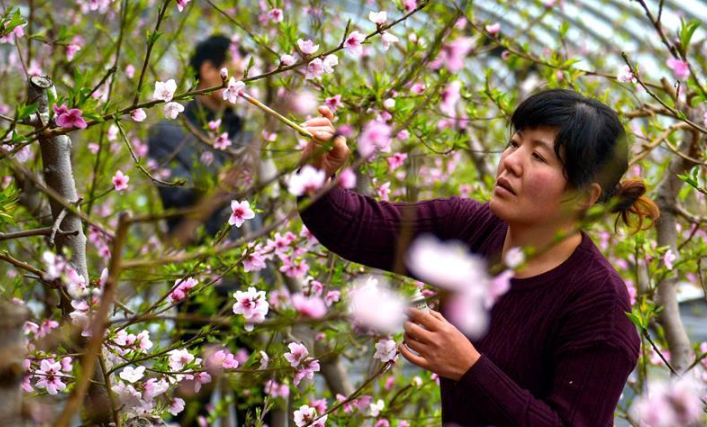 随着气温升高,河北省邯郸市邯山区硕果春农业园大棚内的桃花竞相绽放。