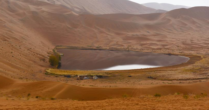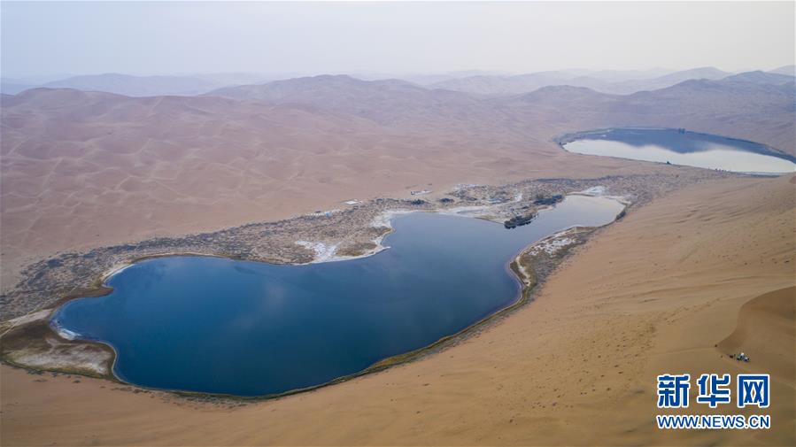 沙丘起伏的曲线陡变成高耸的沙山,碧蓝的湖泊散落在沙海间。