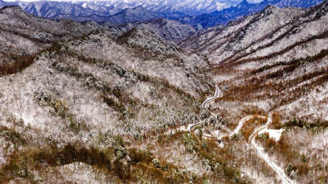 当日,秦岭初雪,色彩斑斓的秋色在白雪映衬下,美如画卷,置身其间,恍若进入童话世界