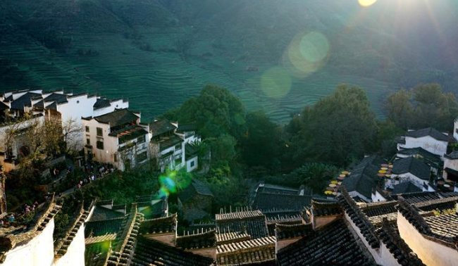 雨后放晴的江西婺源县,蓝天白云与依山傍水的徽派古村落形成了一幅幅美丽画卷。