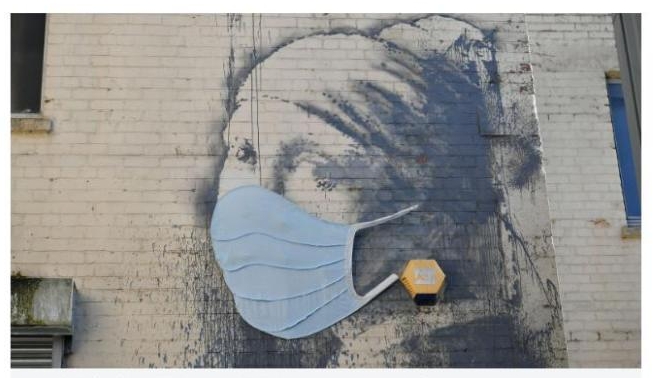 据英国天空新闻网23日报道,英国涂鸦艺术家班克西2014年曾在家乡布理斯托尔一幢建筑外墙上,模仿17世纪名画《戴珍珠耳环的少女》创作了涂鸦画《穿耳膜的少女》。在新冠疫情背景下,少女现在又被“戴”上了蓝色的医用外科口罩。