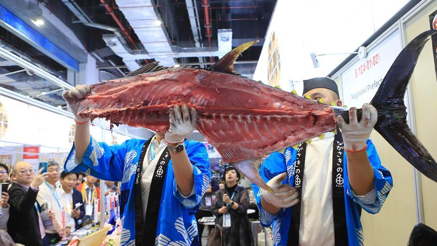 11月7日,来自日本长崎鱼市株式会社的专业切鱼师傅现场解体一条70公斤的蓝鳍金枪鱼,吸引大量参观者观看、品尝。
