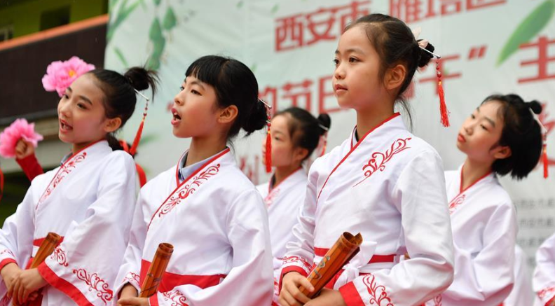 当日,陕西师范大学附属小学在位于西安的校园里举行传统民俗活动迎接即将到来的端午节。