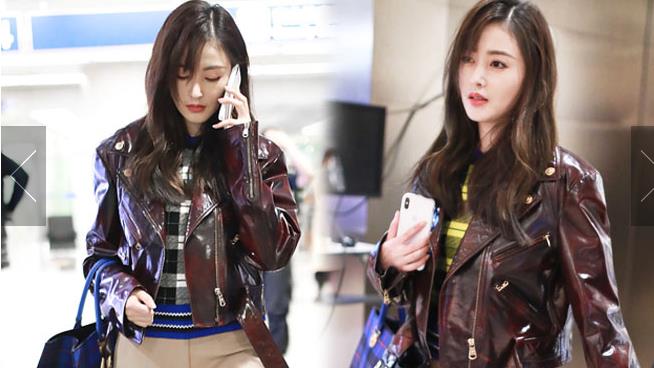 张天爱漆皮夹克又潮又帅 低头疾走打电话气场十足