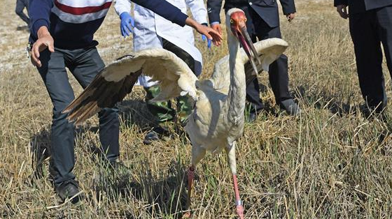 当日,在吉林省莫莫格国家级自然保护区,江西省野生动植物救护繁育中心工作人员将一只在江西鄱阳湖区“落单”的小白鹤放飞野外。