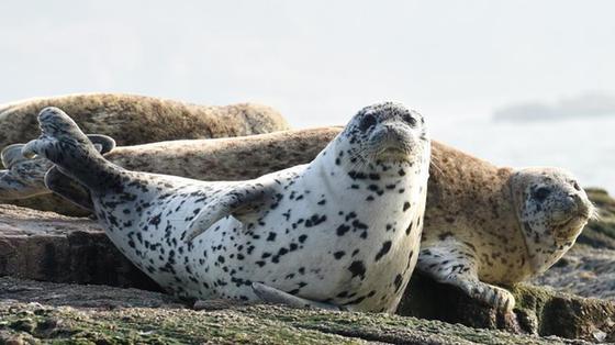 在山东省长岛县钓鱼岛景区附近海域,几只斑海豹趴在海中的礁石上晒太阳,憨态可掬。