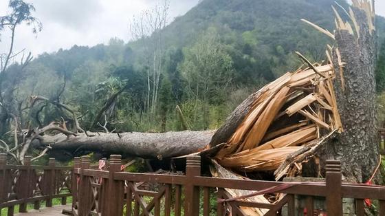 陕西汉中,4月4日夜,当地狂风骤雨,电闪雷鸣,天气异常,夫妻古树被大风刮到。