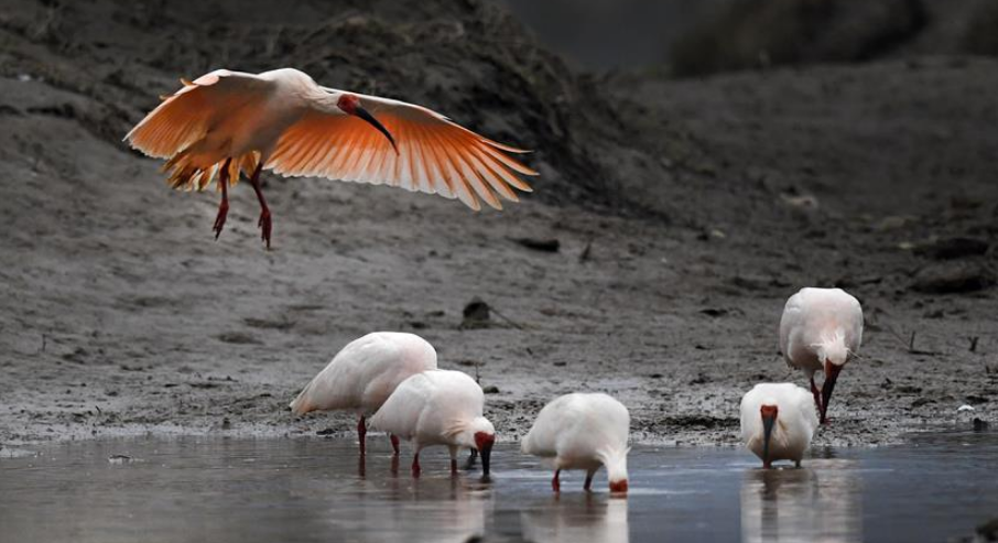 每年冬季,成群结队的朱鹮飞翔在汉江及汉江支流的河滩、湿地,觅食、栖息,成为当地一道亮丽的风景线。